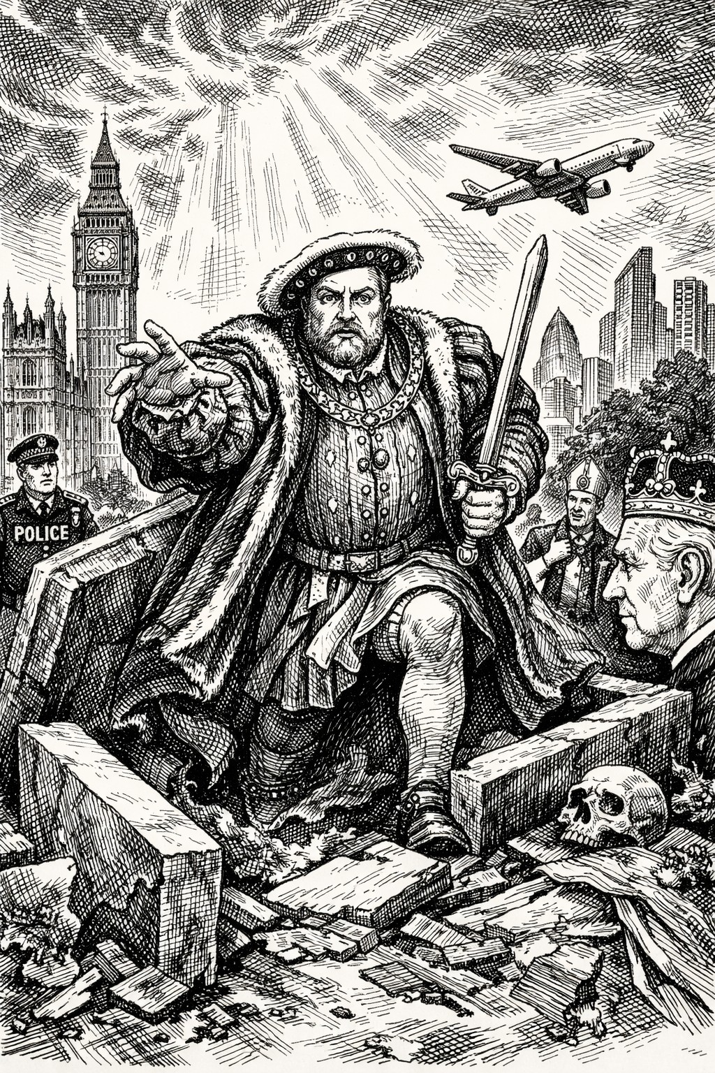 Would he try to claim the throne? Absolutely. Henry VIII would not merely claim to be King. He would insist upon it with the full force of his personality—commanding, theatrical, and utterly convinced of his own legitimacy. He would argue that kingship is ordained by God, not Parliament, that death does not nullify divine authority, that resurrection is the ultimate proof of divine favor, and that no modern monarch, however beloved, could claim such a sign. He would likely view the current royal family with a mixture of curiosity and disdain. He would respect their lineage—after all, they descend from his sister Margaret—but he would see their constitutional limitations as a tragic diminishment of royal power. He would not understand why a monarch would accept such constraints. He would not understand why a monarch would not command armies, appoint bishops, or shape national policy. He would see the modern monarchy as a hollowed‑out institution, a ceremonial relic, and he would believe he had been sent to restore its former glory.